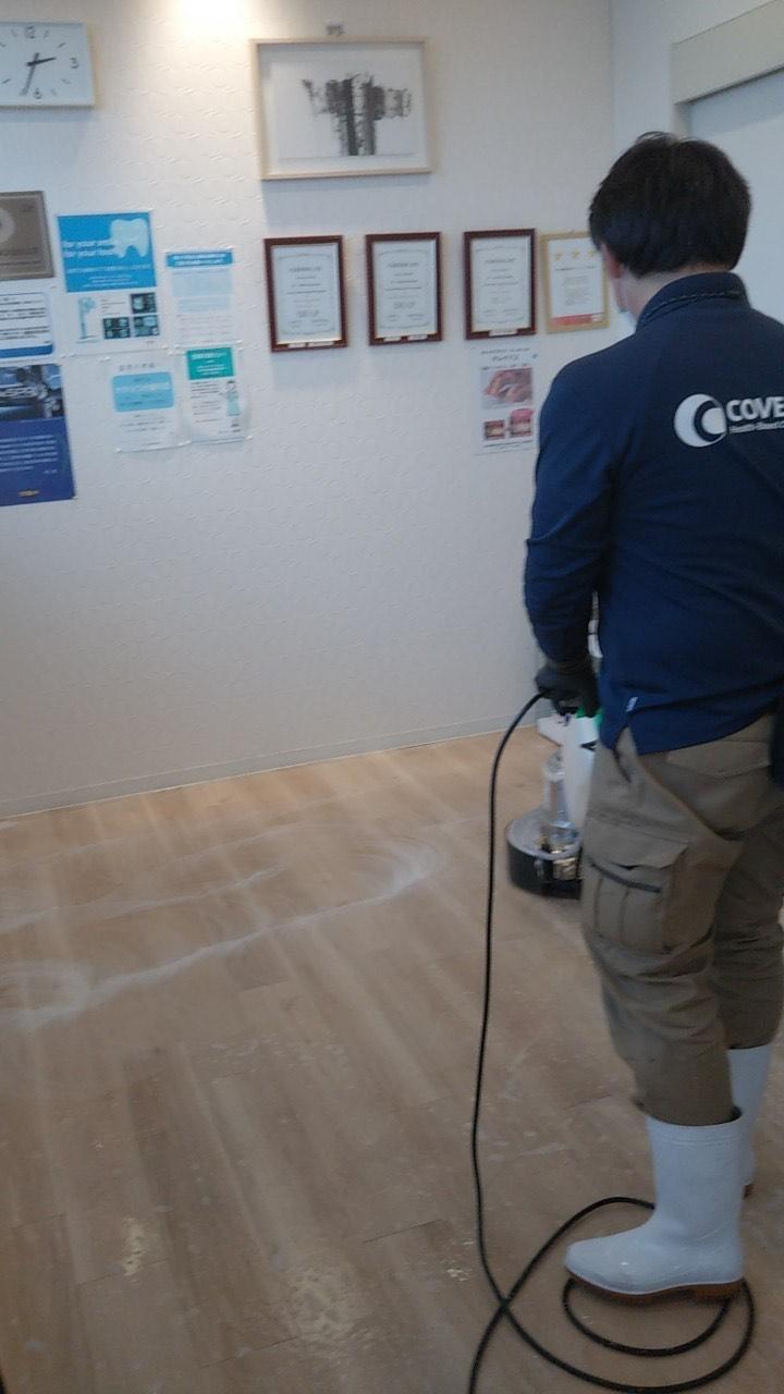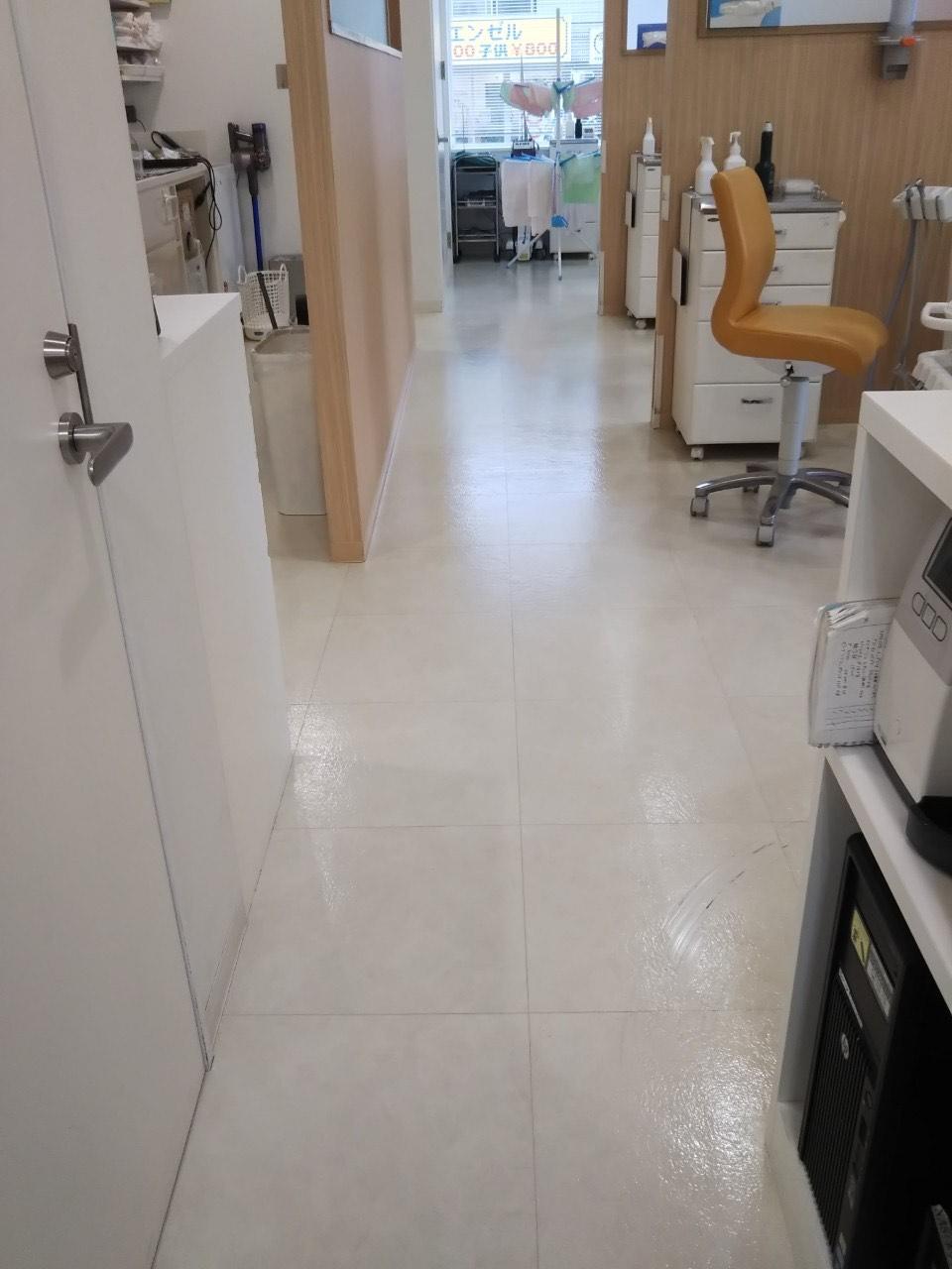 待合室、診察室の床面の清掃です。 洗剤を使用してポリッシャーで洗浄しています。